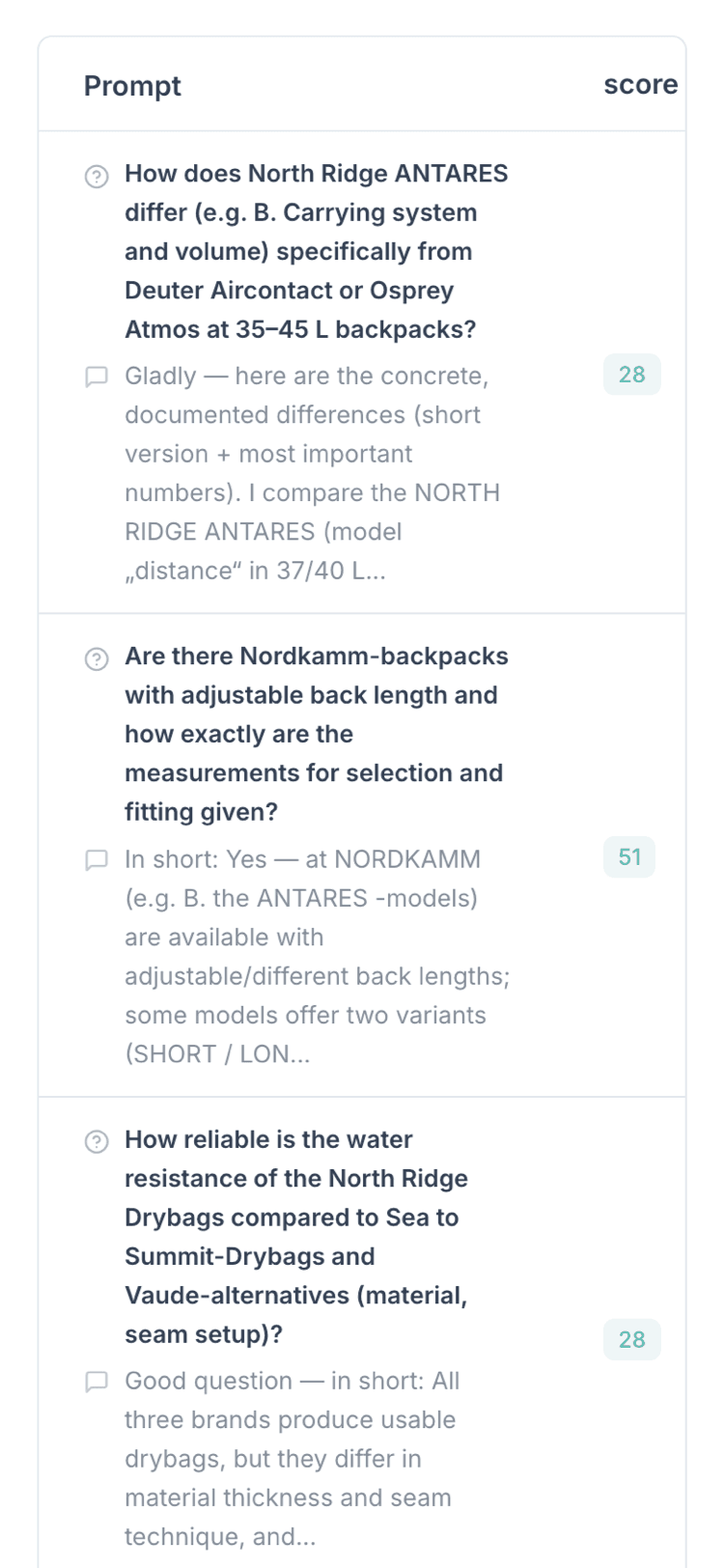 See where your brand appears in questions customers ask AI when they compare options and get ready to choose.